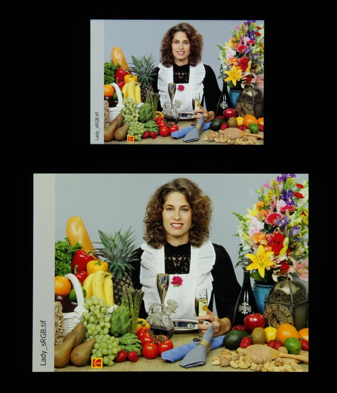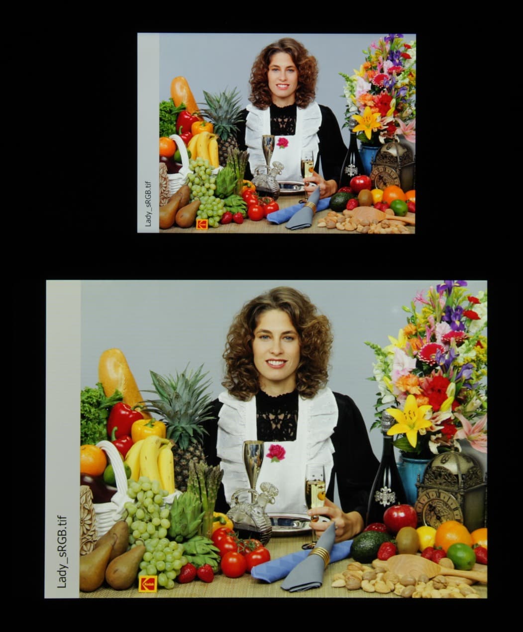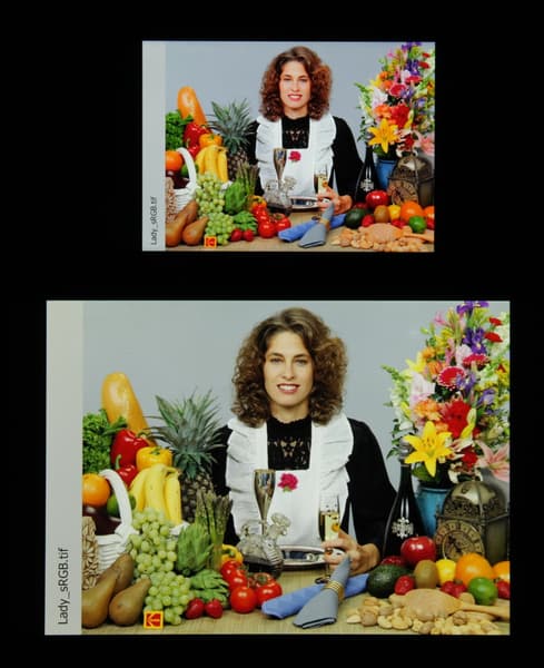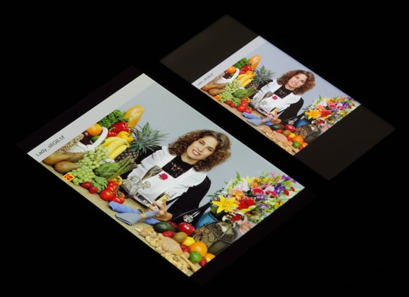 Спектры компонент достаточно хорошо разделены, что и обуславливает слегка увеличенный цветовой охват. Для потребительского устройства широкий цветовой охват является никак не достоинством, а существенным недостатком, поскольку в итоге цвета изображений — рисунков, фотографий и фильмов, — ориентированных на пространство sRGB (а таких подавляющее большинство), имеют неестественную насыщенность. В данном случае это усугублено завышенным цветовым контрастом. Неестественность цветов особенно заметна на узнаваемых оттенках, например на оттенках кожи. Результат приведен на фотографиях выше.