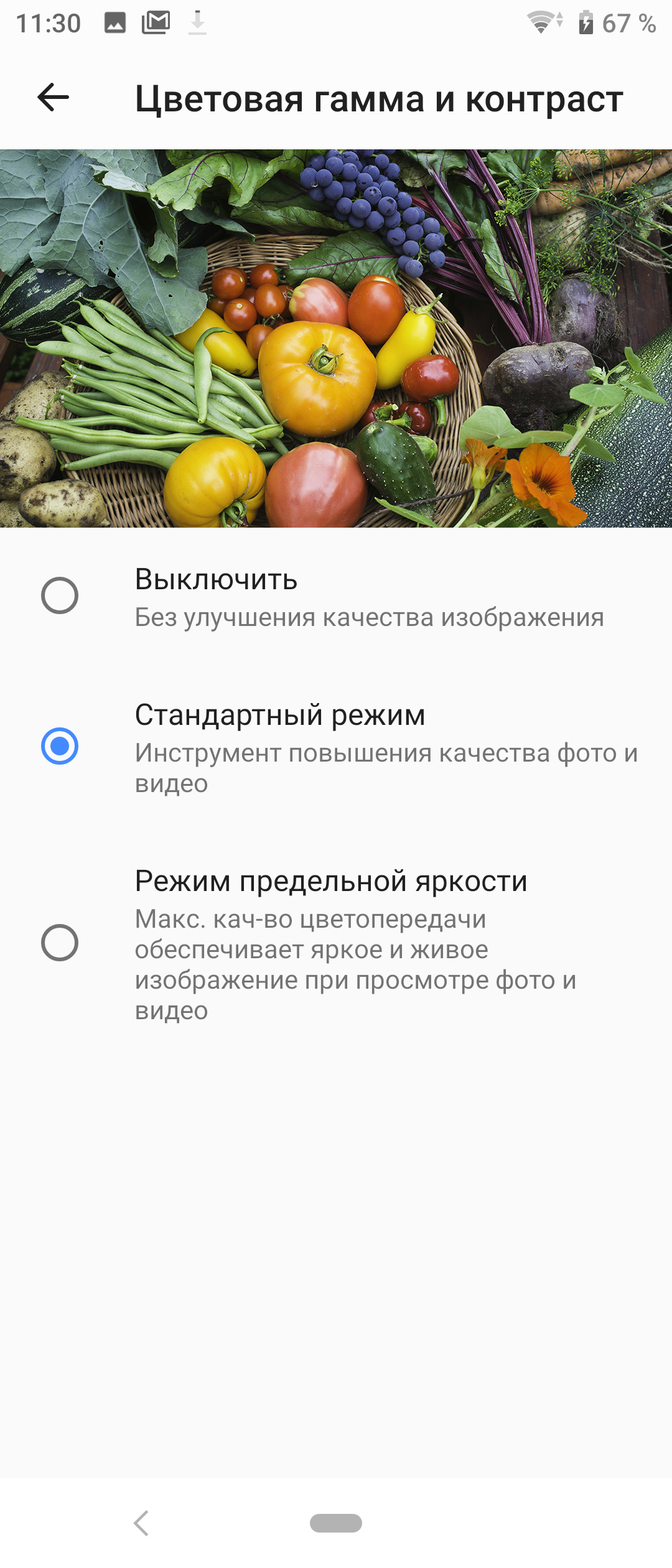 Таким образом, чтобы получить правильные цвета и избавиться от завышения цветового контраста, необходимо выбрать режим Выключить, а затем при желании провести коррекцию цветового баланса, максимально увеличив интенсивность красного цвета. Почему все это должен делать сам покупатель смартфона, якобы ориентированного на просмотр кино, нужно спросить у производителя.