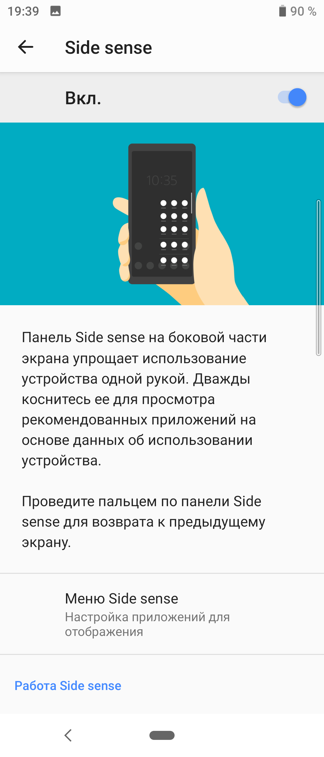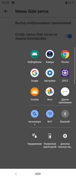Из уникального стоит отметить наличие Side Sense — боковой панели, упрощающей работу с экраном одной рукой. В принципе, в самой идее уменьшения рабочей площади экрана или виртуальной кнопки, разворачивающейся в меню быстрого доступа к самым важным функциям, нет ничего нового, они используются повсеместно. Необычно лишь их объединение, а также уникальное и довольно удобное оформление, хотя Side Sense задумывалась для экранов с загнутыми краями, а не плоских, как здесь. Но хуже от этого не стало, потому что случайно ничего не нажимается и не вызывается, и это хорошо.