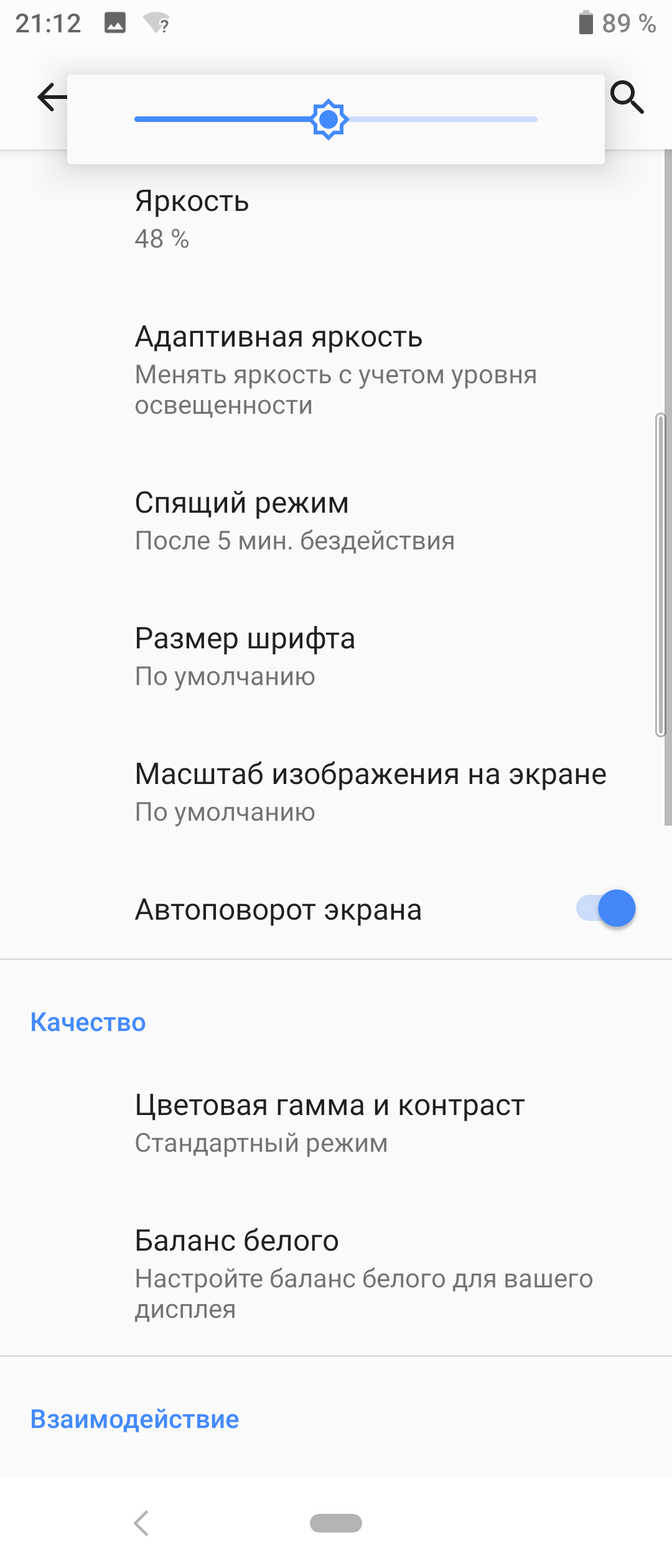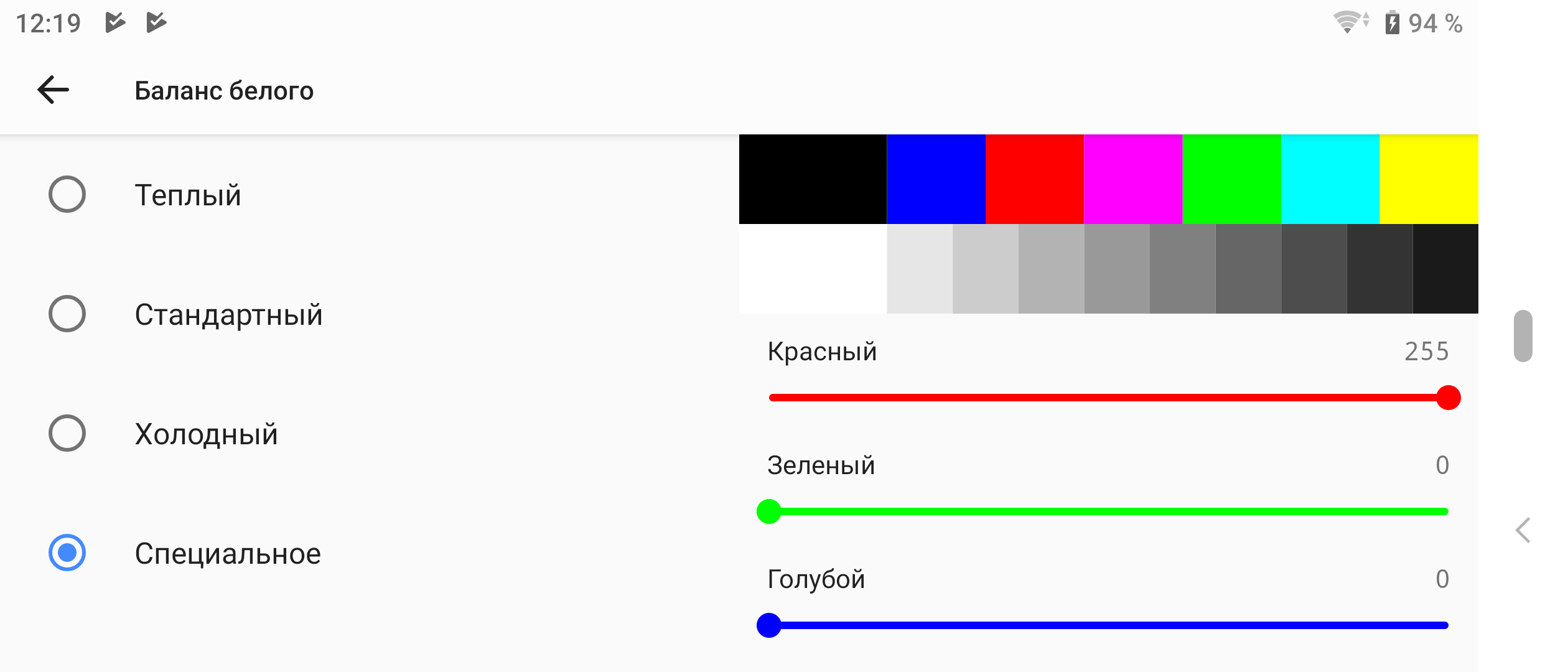 В этом смартфоне есть возможность подправить цветовой баланс регулировками интенсивностей трех основных цветов. Это можно сделать вручную (Специальное), а можно выбрать один из предустановленных вариантов (Теплый, Стандартный или Холодный; по умолчанию — Стандартный).