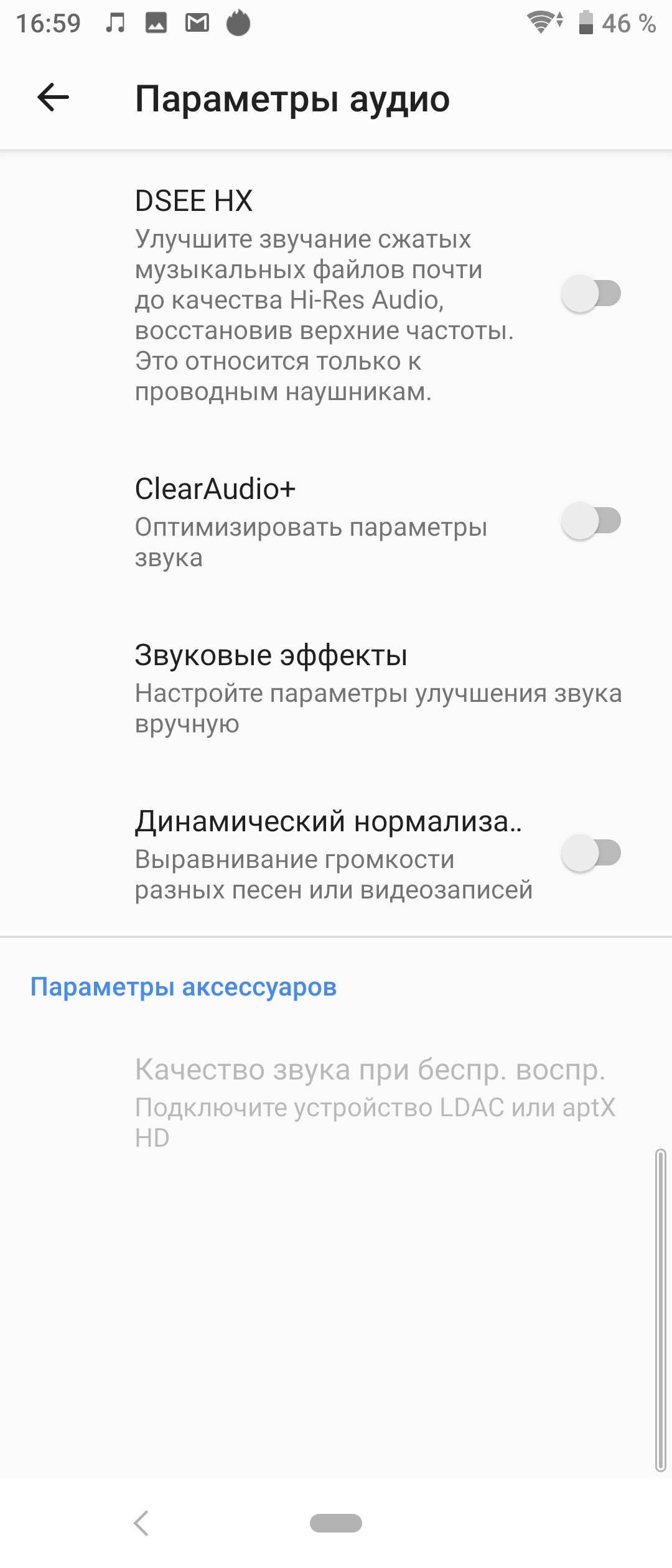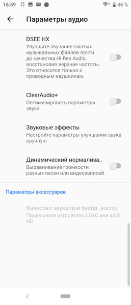 В мультимедийном плане смартфон весьма неплох. Основной динамик, правда, выдает простенький звук, хотя и чрезвычайно громкий: в нем преобладают высокие частоты, порой переходящие в неприятный звон. Зато в наушниках, даже беспроводных, аппарат готов обеспечить богатое, яркое звучание. Настроек, как обычно, максимальное количество, а для беспроводной передачи поддерживаются, как aptX HD, так и собственный кодек LDAC. Так что практически с любыми наушниками Sony Xperia 10 будет звучать качественно. В смартфоне предустановлено FM-радио (работает только с наушниками), а вот штатного диктофона традиционно не предусмотрено.