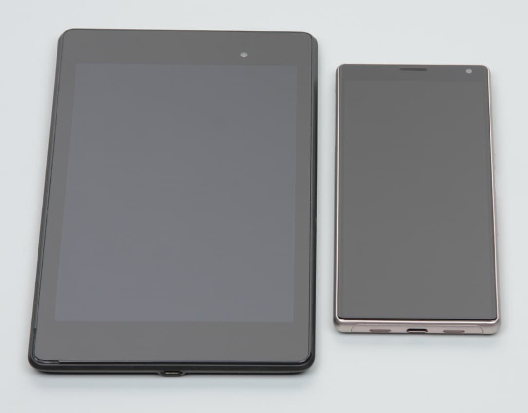 Лицевая поверхность экрана выполнена в виде стеклянной пластины с зеркально-гладкой поверхностью, устойчивой к появлению царапин. Судя по отражению объектов, антибликовые свойства экрана лучше, чем у экрана Google Nexus 7 (2013) (далее просто Nexus 7). Для наглядности приведем фотографию, на которой в выключенных экранах обоих устройств отражается белая поверхность (Sony Xperia 10, как нетрудно определить, — справа, далее их можно различать по размеру):