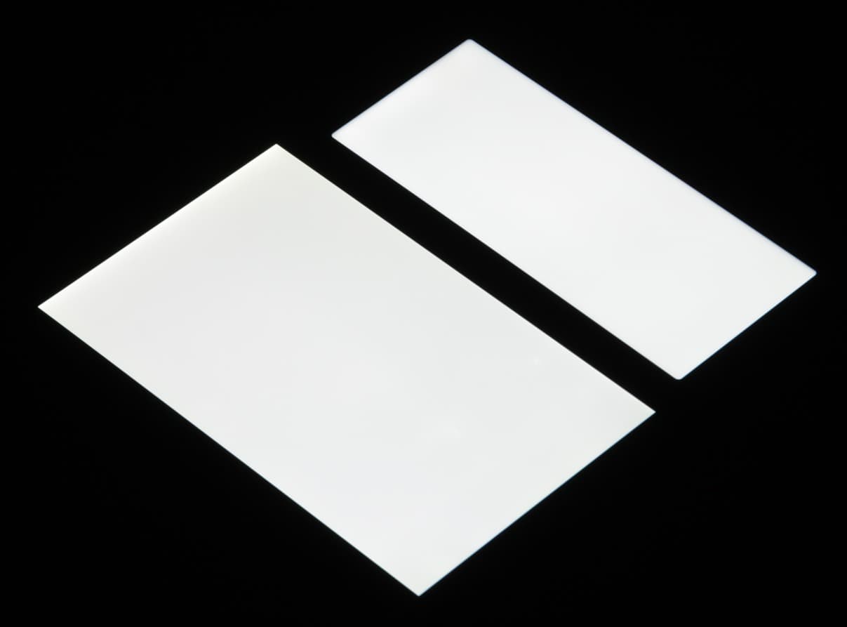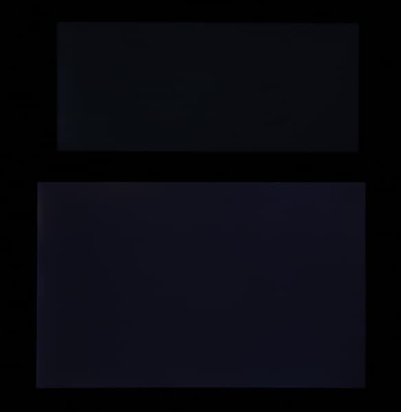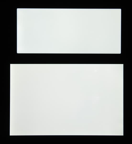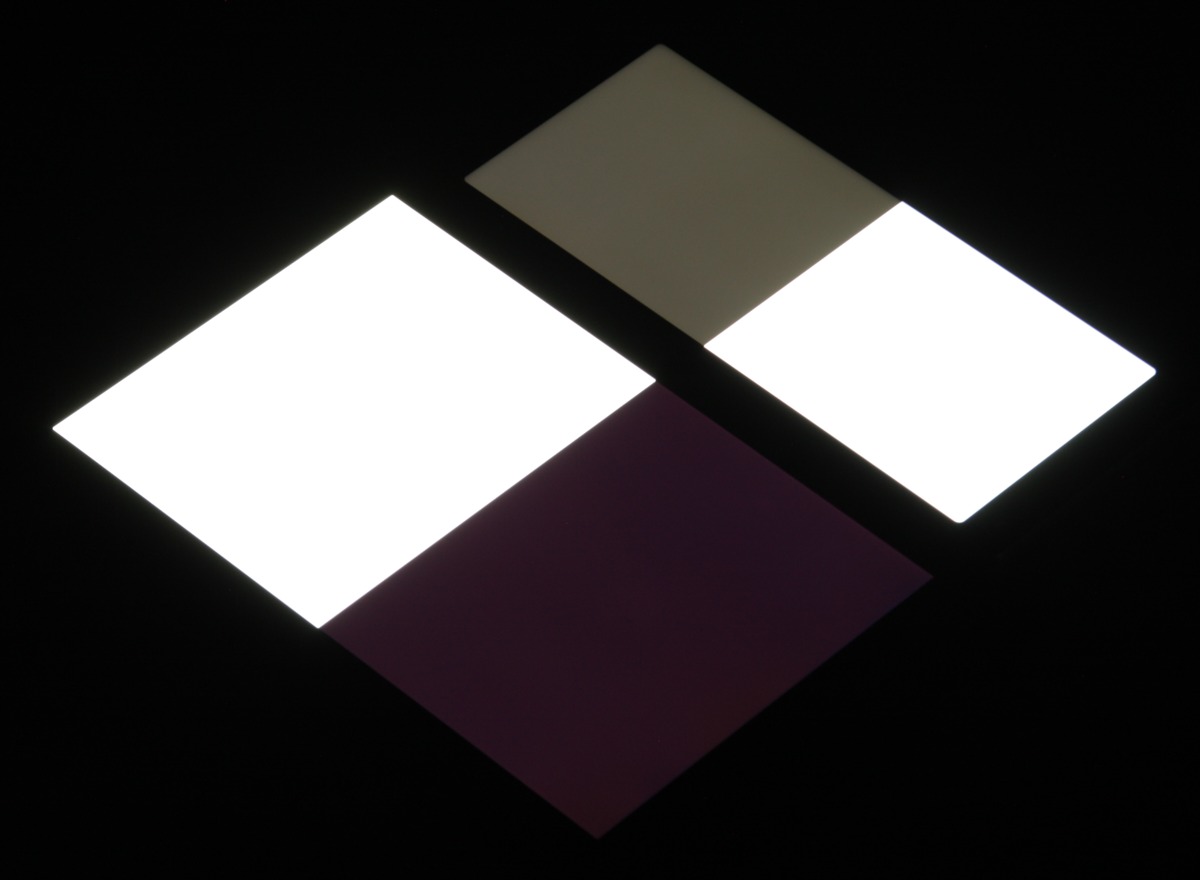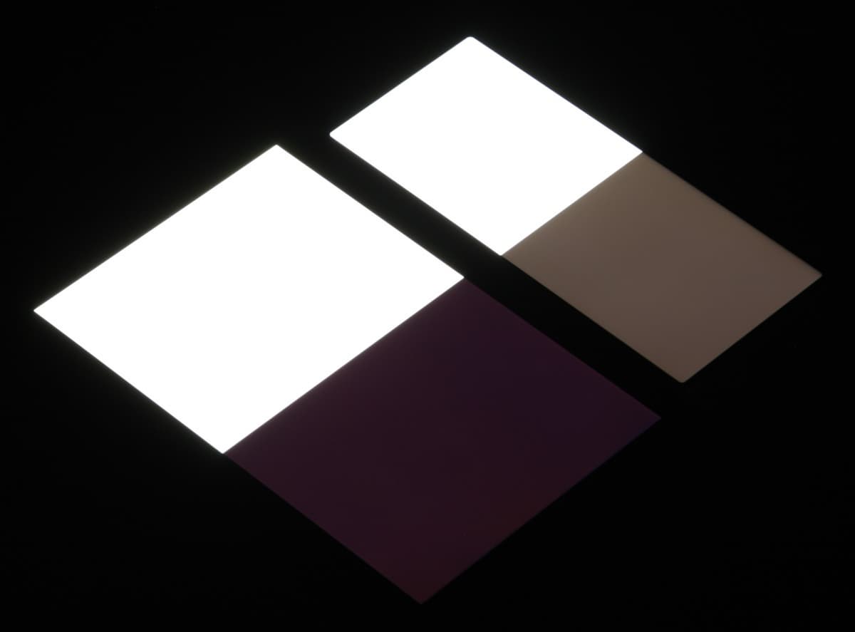 Яркость под углом у обоих экранов заметно уменьшилась (примерно в 5 раз, исходя из разницы в выдержке), но у Sony Xperia 10 экран все же немного светлее. Черное поле при отклонении по диагонали высветляется сильно и приобретает легкий красноватый оттенок. Фотографии ниже это демонстрируют (яркость белых участков в перпендикулярном плоскости экранов направлении у экранов одинаковая!):