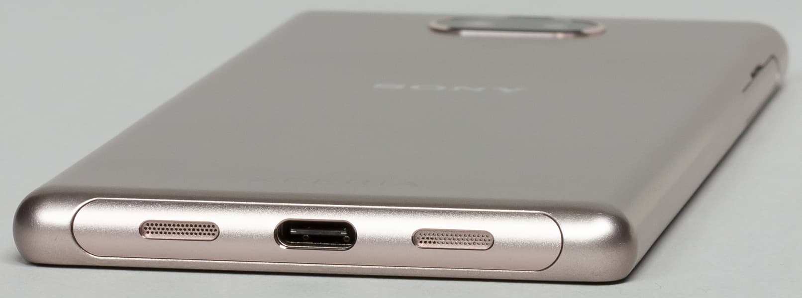 В нижнем торце установлен разъем USB Type-C. Сюда же выведены основной громкоговоритель, а также разговорный микрофон, который скрыт за схожей по форме решеткой, но с меньшим количеством «реальных» отверстий, ибо часть из них — бутафорские, не сквозные.