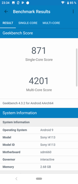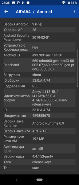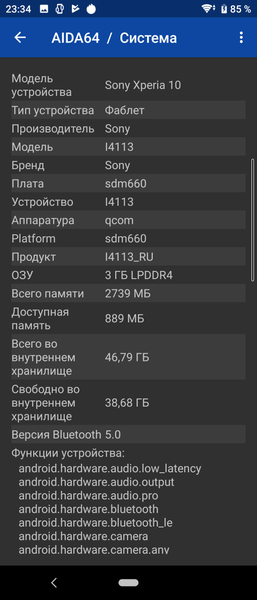 Sony Xperia 10 работает на SoC Qualcomm Snapdragon 630, у которой 8 процессорных ядер Cortex-A53 в двух кластерах: 4@1,8 ГГц и 4@2,2 ГГц. За обработку графики отвечает GPU Adreno 508. Объем оперативной памяти составляет 3 ГБ (свободно 900 МБ), а встроенной флэш-памяти — 64 ГБ (изначально свободно около 47 ГБ).