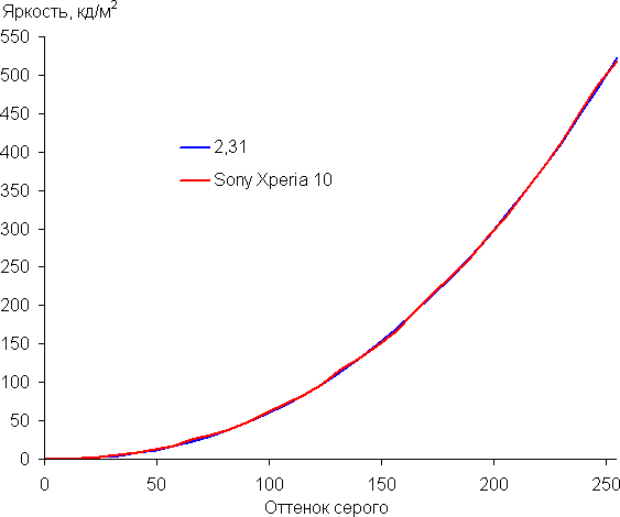 Контрастность (примерно в центре экрана) высокая — порядка 1500:1. Время отклика при переходе черный-белый-черный равно 20 мс (10 мс вкл. + 10 мс выкл.). Переход между полутонами серого 25% и 75% (по численному значению цвета) и обратно в сумме занимает 39 мс. Построенная по 32 точкам с равным интервалом по численному значению оттенка серого гамма-кривая не выявила завала ни в светах, ни в тенях. Показатель аппроксимирующей степенной функции равен 2,31, что немного выше стандартного значения 2,20, поэтому картинка чуть затемнена. При этом реальная гамма-кривая слегка отклоняется от степенной зависимости: