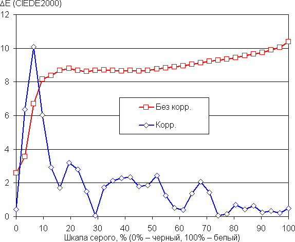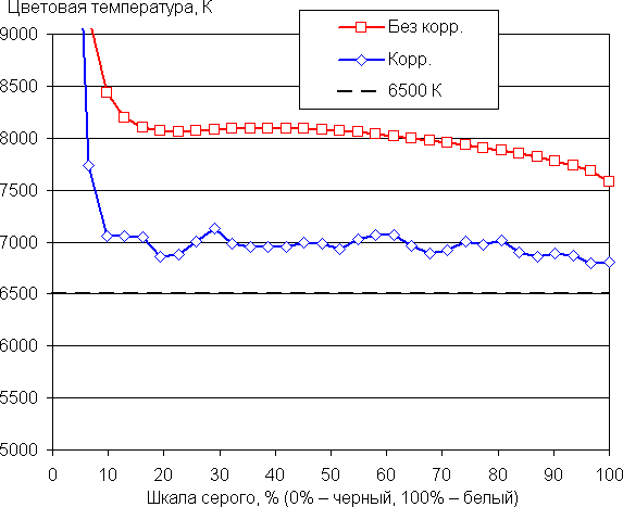 По умолчанию баланс оттенков на шкале серого приемлемый, так как цветовая температура не очень сильно выше стандартных 6500 К, да и отклонение от спектра абсолютно черного тела (ΔE) на большей части шкалы серого ниже 10, что для потребительского устройства считается неплохим показателем (данные, подписанные как Без корр. на графиках ниже). При этом цветовая температура и ΔE мало изменяются от оттенка к оттенку — это положительно сказывается на визуальной оценке цветового баланса. (Самые темные области шкалы серого можно не учитывать, так как там баланс цветов не имеет большого значения, да и погрешность измерений цветовых характеристик на низкой яркости большая.)
