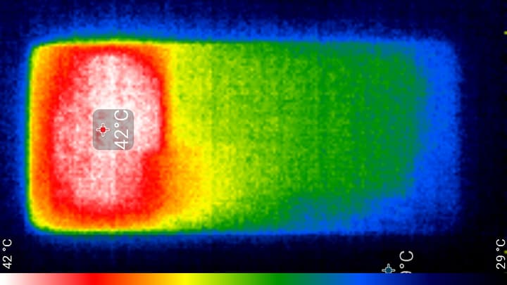 Нагрев выше в верхней части аппарата, что, видимо, соответствует расположению микросхемы SoC. По данным теплокамеры, максимальный нагрев составил 42 градуса (при температуре окружающего воздуха в 24 градуса). Такой нагрев нельзя назвать незначительным.