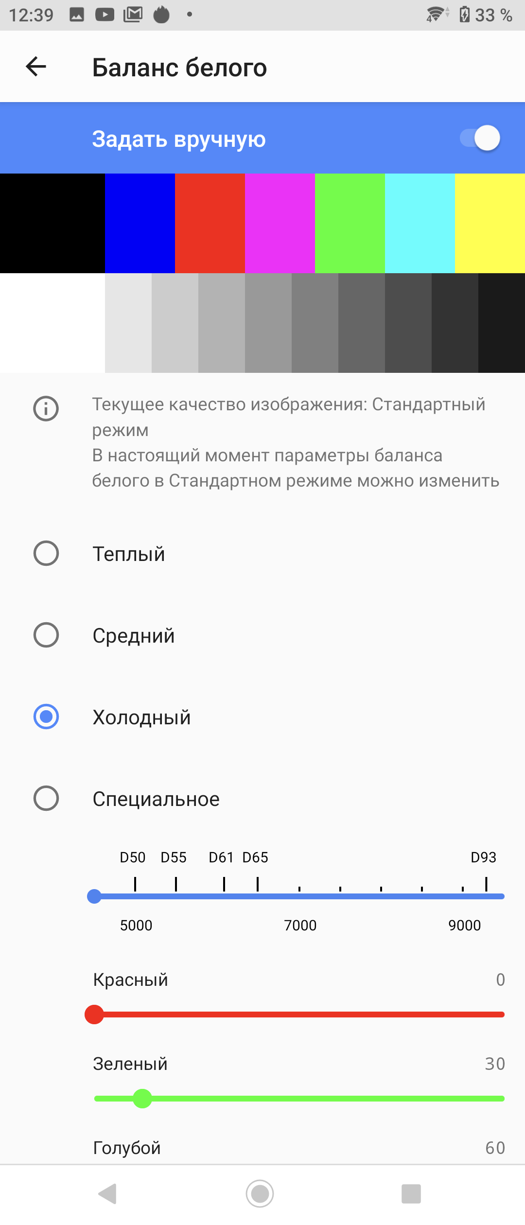 В этом устройстве есть возможность скорректировать цветовой баланс с помощью выбора готового профиля, выбора цветовой температуры на шкале или подстройкой интенсивности трех цветов: