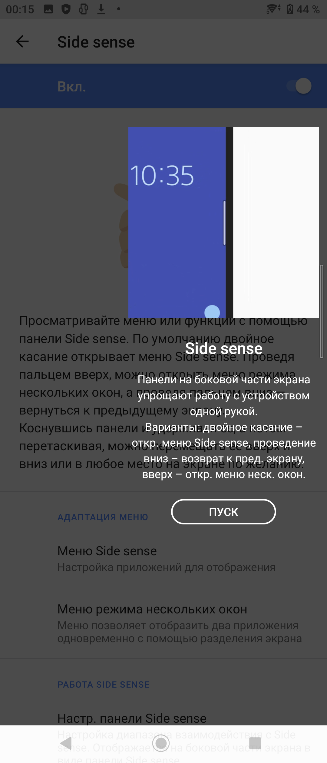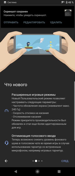 В качестве программной платформы используется ОС Android 10-й версии. Интерфейс настолько «чист», что напоминает незамутненную ОС Android. Но это касается оформления. А вот функциональные возможности встроенного ПО максимально расширены: есть игровой режим с отключением всех навязчивых всплывающих окон, режим связи с игровой приставкой PlayStation, управление одной рукой, жестами, виртуальная боковая панель, разделение экрана на два окна и многое другое. Действие глобальной темной темы распространяется на все фирменные приложения. А вот функции разблокировки по лицу здесь нет вовсе.