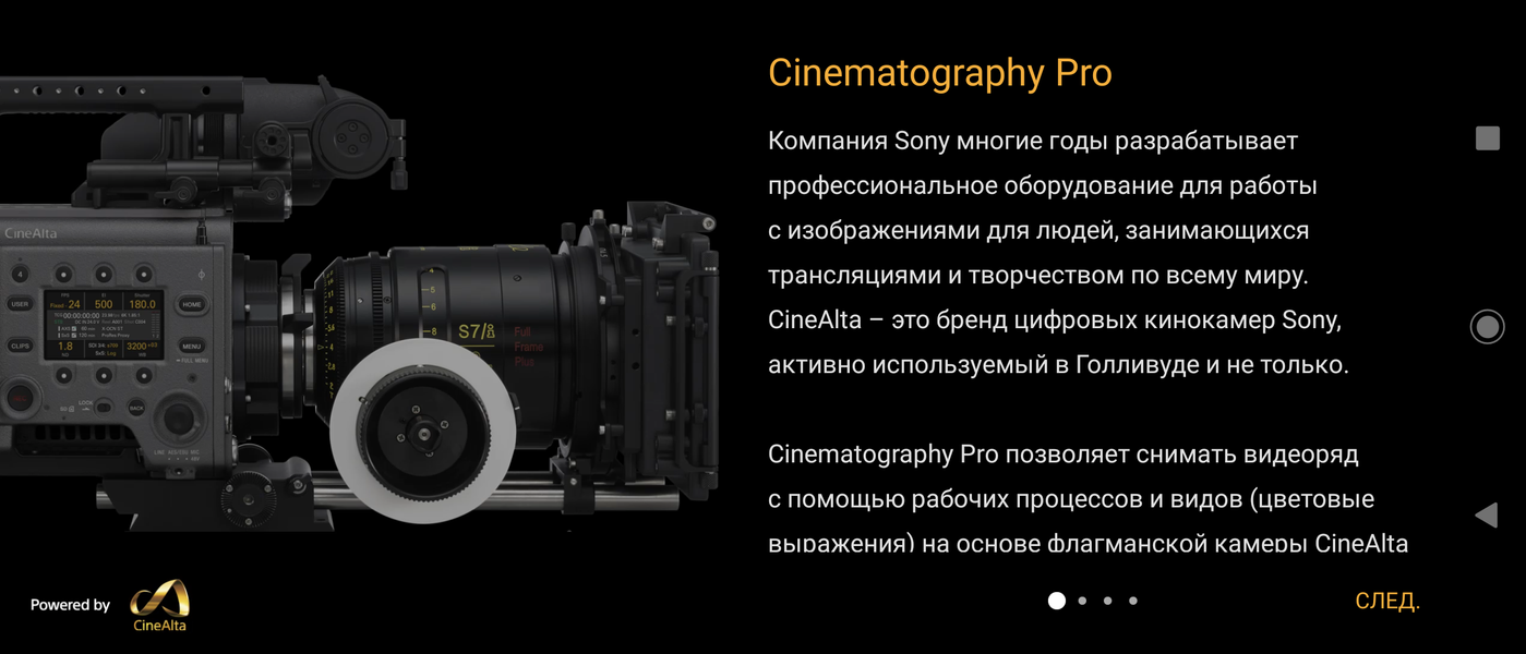 Для любителей ручного управления введены два продвинутых режима: Photo Pro и Cinema Pro. В них настройки повторяют интерфейс управления настоящими фотоаппаратами и видеокамерами Sony.