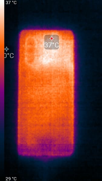 Нагрев больше в верхней части аппарата, что, видимо, соответствует расположению микросхемы SoC. По данным теплокамеры, максимальный нагрев составил 37 градусов (при температуре окружающего воздуха в 24 градуса), это не очень много.