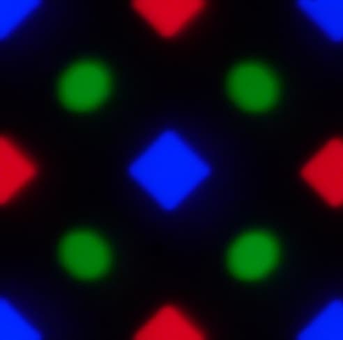 В этом экране используется матрица Super AMOLED — активная матрица на органических светодиодах. Полноцветное изображение создается с помощью субпикселей трех цветов — красного (R), зеленого (G) и синего (B), но красных и синих субпикселей в два раза меньше, что можно обозначить как RGBG. Это подтверждается фрагментом микрофотографии: