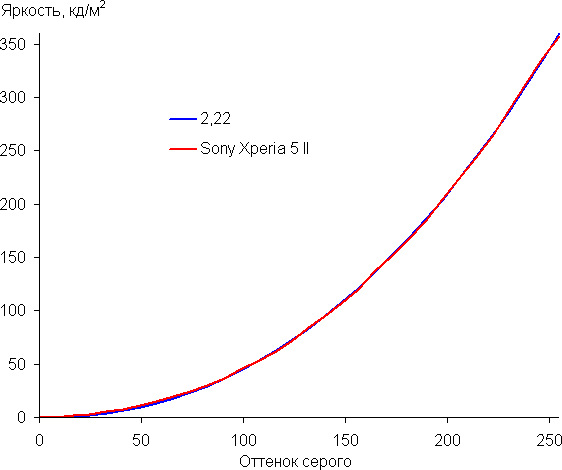 Построенная по 32 точкам с равным интервалом по численному значению оттенка серого гамма-кривая показала, что существенного завала нет ни в светах, ни в тенях. Показатель аппроксимирующей степенной функции равен 2,22, что близко к стандартному значению 2,2. При этом реальная гамма-кривая мало отклоняется от степенной зависимости: