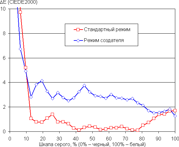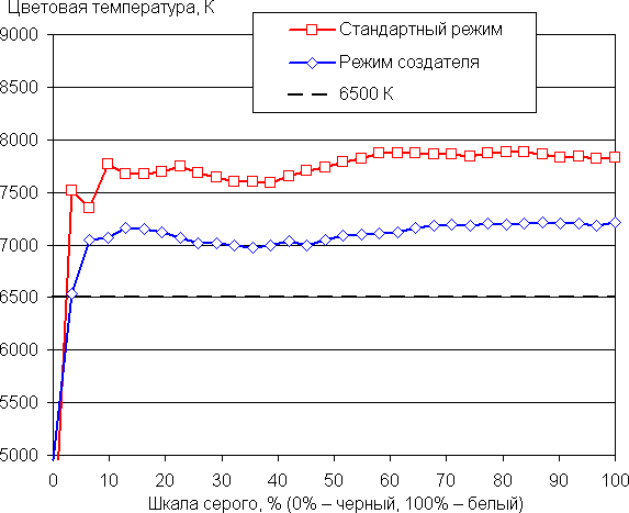 Баланс оттенков на шкале серого после выбора профиля Режим создателя хороший — цветовая температура не сильно выше стандартных 6500 К, при этом на значимом участке шкалы серого этот параметр изменяется мало, что улучшает визуальное восприятие баланса цветов. Отклонение от спектра абсолютно черного тела (ΔE) на большей части шкалы серого остается ниже 10 единиц, что для потребительского устройства считается хорошим показателем, и разброс этой характеристики также не очень большой. Впрочем, и в режиме Стандартный режим баланс оттенков неплохой: