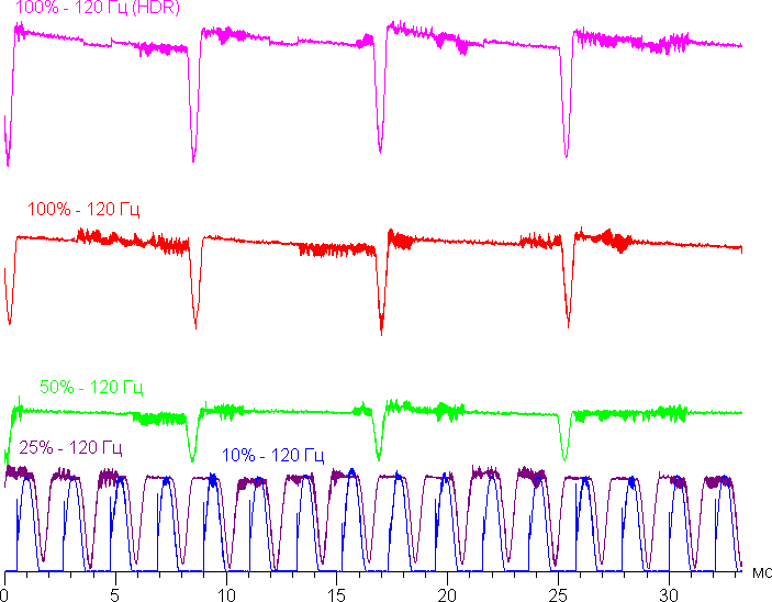 В режиме 120 Гц плавность прокрутки списков меню заметно повышается. Посмотрим, изменится ли при этом характер модуляции: