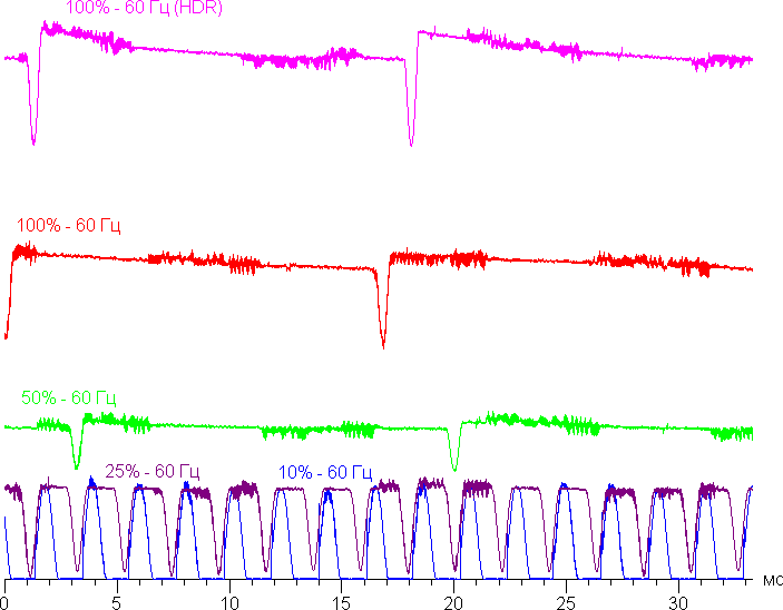 На любом уровне яркости присутствует значимая модуляция с частотой 59,5, 119 или 476 Гц. На рисунке ниже приведены зависимости яркости (вертикальная ось) от времени (горизонтальная ось) для нескольких значений настройки яркости. Сначала для режима с частотой обновления 60 Гц:
