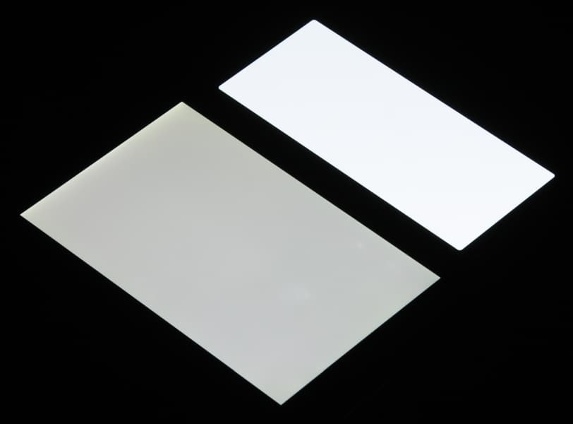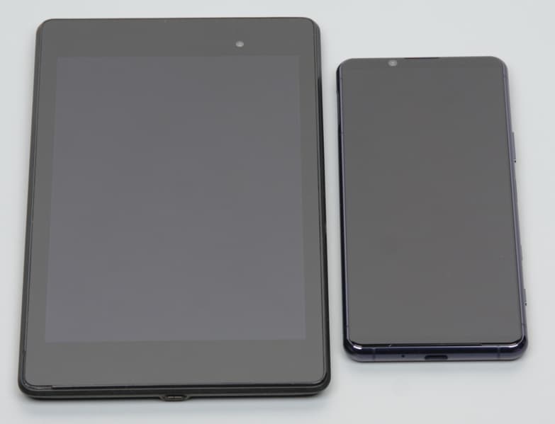 Лицевая поверхность экрана выполнена в виде стеклянной пластины с зеркально-гладкой поверхностью, устойчивой к появлению царапин. Судя по отражению объектов, антибликовые свойства экрана лучше, чем у экрана Google Nexus 7 (2013) (далее просто Nexus 7). Для наглядности приведем фотографию, на которой в выключенных экранах отражается белая поверхность (слева — Nexus 7, справа — Sony Xperia 5 II, далее их можно различать по размеру):
