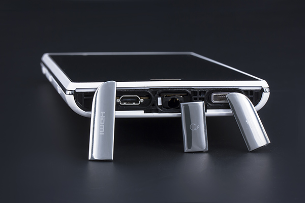 Верхняя грань отчего-то получила металлизированное напыление, что на фоне остальных белых пластиковых элементов корпуса выглядит весьма нелепо и портит весь внешний вид устройства, лишая его законченности. Эта грань фактически состоит из трех заглушек, все три из которых имеют разные размеры. Под заглушками прячутся разъемы под аудиоджек 3,5 мм, Micro-USB и Micro-HDMI. Кстати, кабель Micro-HDMI в комплект поставки не входит. Все крышки имеют резиновые прокладки и плотно закрываются, что логично: ведь телефон должен иметь возможность выдерживать давление направленных струй воды (дождь, вода из смесителя) и кратковременные погружения в пресную воду на глубину до 1 метра в течение 30 минут. По этим параметрам Sony Xperia acro S официально соответствует классификации IP 57.