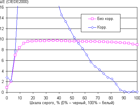 В итоге визуально цвета имеют естественную насыщенность. Баланс оттенков на шкале серого приемлемый, так как цветовая температура близка к стандартным 6500 К, а отклонение от спектра абсолютно черного тела (ΔE) меньше 10, что для потребительского устройства считается хорошим показателем. При этом цветовая температура и ΔE мало изменяются от оттенка к оттенку — это положительно сказывается на визуальной оценке цветового баланса. (Самые темные области шкалы серого можно не учитывать, так как там баланс цветов не имеет большого значения, да и погрешность измерений цветовых характеристик на низкой яркости большая.)