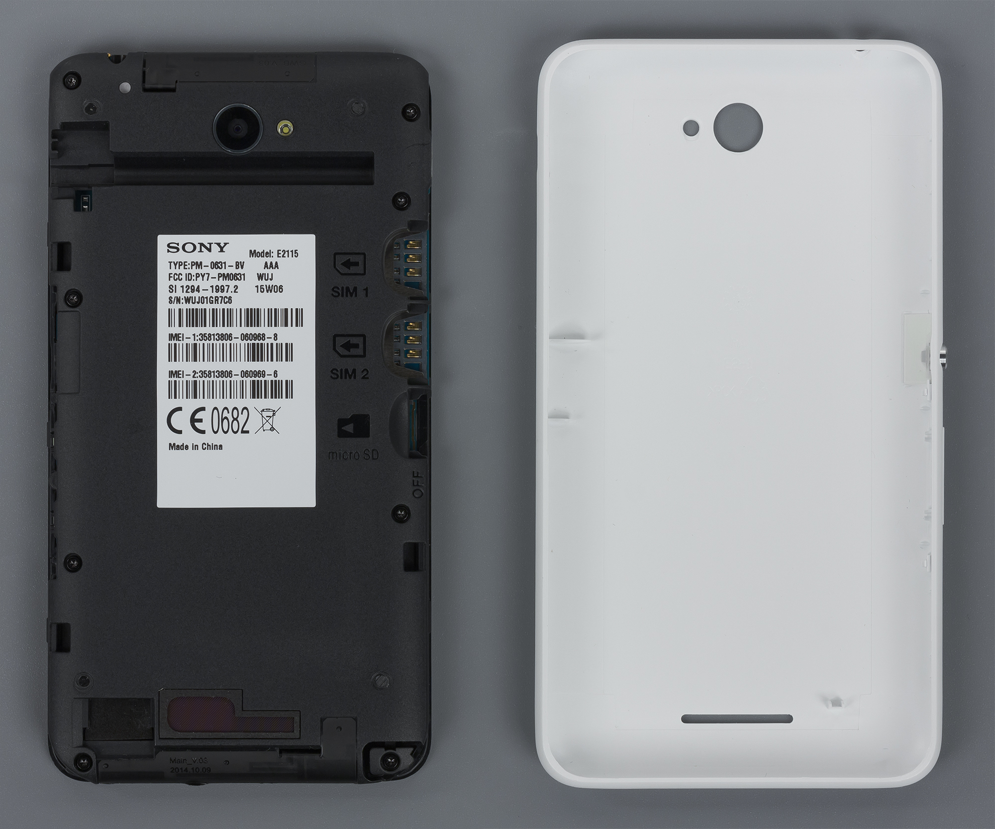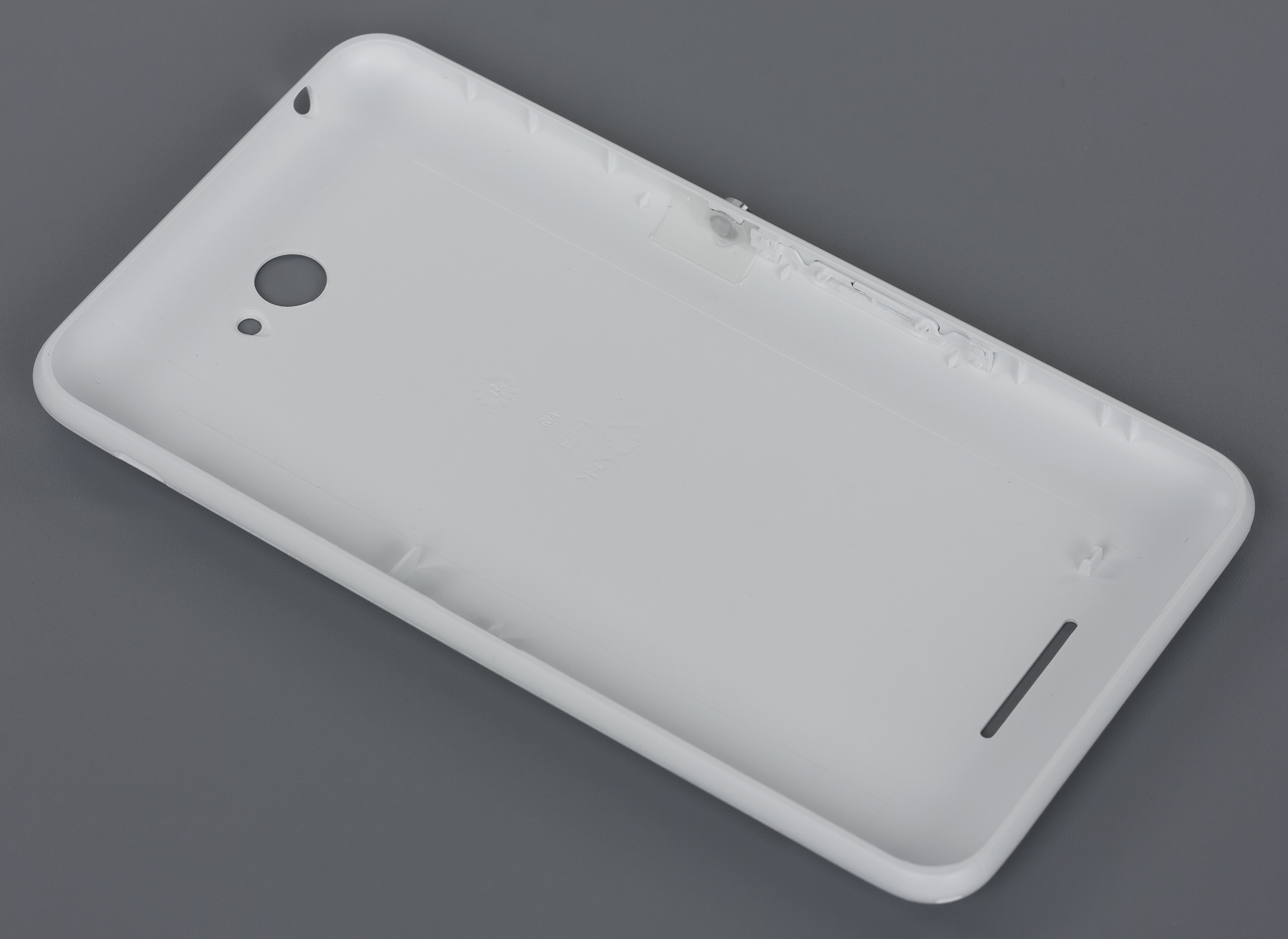 Небольшой по размерам корпус Sony Xperia E4 Dual имеет достаточно простенькое устройство: бо́льшую его часть составляет целиковый пластиковый кожух, который надевается на остов и образует не только заднюю крышку, но и боковины — этакое корытце из дешевой матовой пластмассы. Масса смартфона невелика, за счет небольших габаритов можно с комфортом удерживать аппарат в руке. Маркими его поверхности не назовешь, хотя матовый пластик здесь твердый и даже немного скользкий — чуть прорезиненный эффект soft-touch ему бы точно не помешал. Кстати, таковой имеется у корпуса в модификации Xperia E4g, и это приятно отличает модель с поддержкой LTE от обычной модификации, побывавшей у нас на тестировании.
