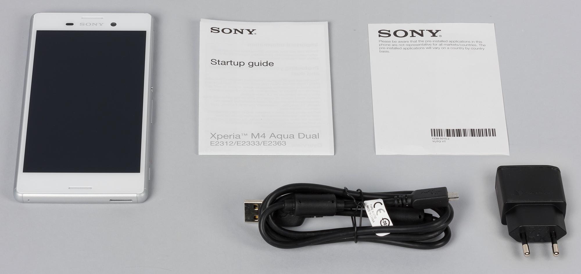 Смартфон Sony Xperia М4 Aqua Dual поставляется в продажу в очень простой плоской утилитарного вида коробке из тонкого нелакированного картона. Упаковки смартфонов Sony часто имеют невзрачный малопривлекательный вид, этим как бы подчеркивается стремление компании заботиться об окружающей среде, ведь такая коробка в основном сделана из переработанных материалов с применением соевых чернил (легко разлагающихся после утилизации).