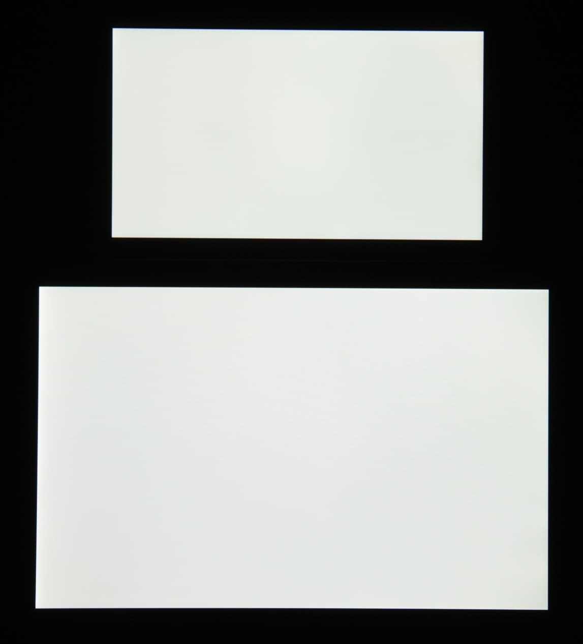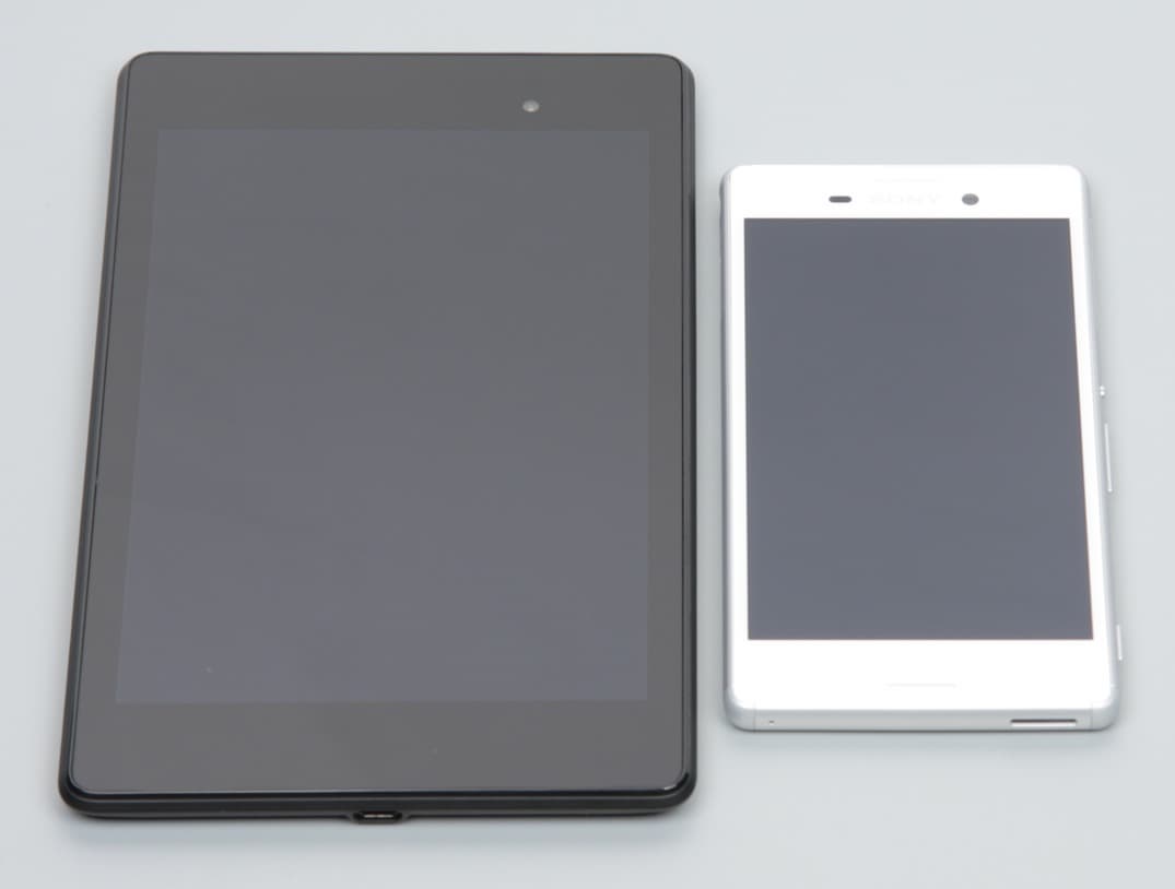 Лицевая поверхность экрана выполнена в виде стеклянной пластины с зеркально-гладкой поверхностью, устойчивой к появлению царапин. Судя по отражению объектов антибликовые свойства экрана не хуже, чем у экрана Google Nexus 7 (2013) (далее просто Nexus 7). Для наглядности приведем фотографию, на которой в выключенных экранах отражается белая поверхность (слева — Nexus 7, справа — Sony Xperia M4 Aqua Dual, далее их можно различать по размеру):
