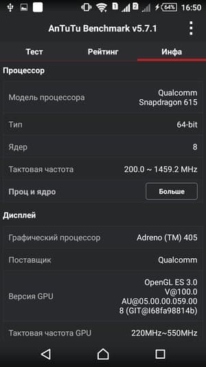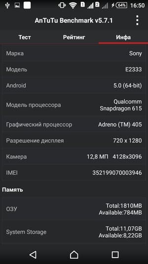 Любопытно, что к этому времени на рынок уже было выпущено несколько мобильных аппаратов, основанных на обновленной и чуть более мощной версии платформы Snapdragon 615 второго поколения. У нее максимальная рабочая частота процессорных ядер увеличена до 1,65 ГГц, и на такой SoC основаны, например, протестированные нами ранее Xiaomi Mi 4i и Lenovo Vibe Shot. По их результатам, проставленным в сравнительную таблицу, видно, насколько производительнее стали данные смартфоны. Но, к сожалению, Sony не пошла по этому пути, установив в свой смартфон модификацию платформы, демонстрирующую гораздо худшие результаты, что, опять же, хорошо видно по данным сравнительной таблицы (впрочем, модель Xperia M4 Aqua, как мы уже упоминали, была анонсирована относительно давно).