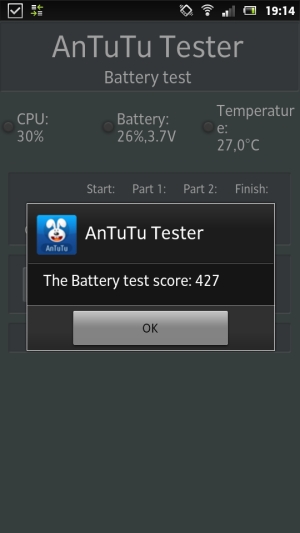 Тестирование не произвело хорошего впечатления — во всех вариантах использования батарея оказалась откровенно слаба. Беспрерывное проигрывание mp3 с выключенным экраном продлилось от одного заряда в течение 24 часа 45 минут, а просмотр видео в контейнере MKV с разрешением 720p занял 4 часа, это немного. Особого смысла «крутить» на Sony Xperia P такое тяжелое видео нет, поэтому мы проверили время работы на примере беспрерывного просмотра файла в контейнере AVI с разрешением 720×400. Этот ролик смартфон проигрывал до полной разрядки в течение 5 часов. Беспрерывное чтение в программе FBreader на среднем уровне яркости продлилось 6 часов. По всем этим показателям смартфон явно отстает от лидеров. Зато, уж и заряжается Sony Xperia P чрезвычайно быстро. Мало того, что сама батарея не велика, так еще и зарядное устройство обладает здесь повышенной мощностью. Время полной зарядки составляет всего 1,5 часа.