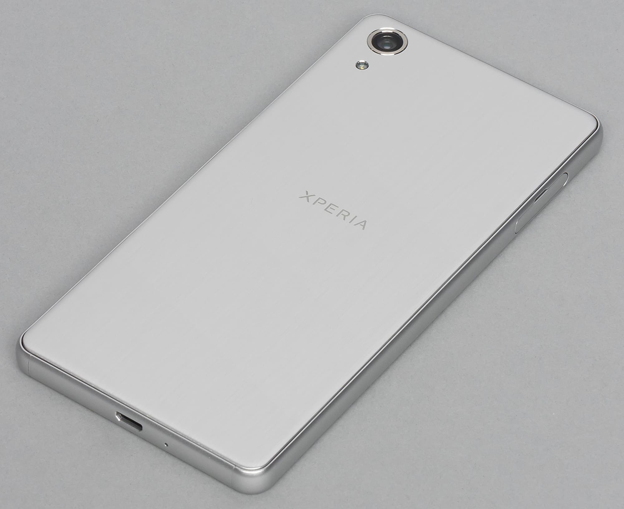 Задняя стенка тоже выполнена из металла, но эти две детали не составляют единое целое, корпус сборный, и поверхности у отдельных частей тут разные. В отличие от боковой рамки, задняя крышка имеет текстурированную поверхность, напоминающую последствия недошлифовки металла. Производитель называет это покрытие brushed aluminium, и имеется оно только у смартфонов X Performance, но не у обычных Х. Правда, оказалось, что и у модели Xperia X Performance эта самая «зашкуренная» поверхность имеется не во всех цветовых вариантах: выразительные текстуры наблюдаются только у черного и серого корпуса, в то время как у розового и лимонного корпуса задняя стенка точно такая же, как у обычного Xperia X.