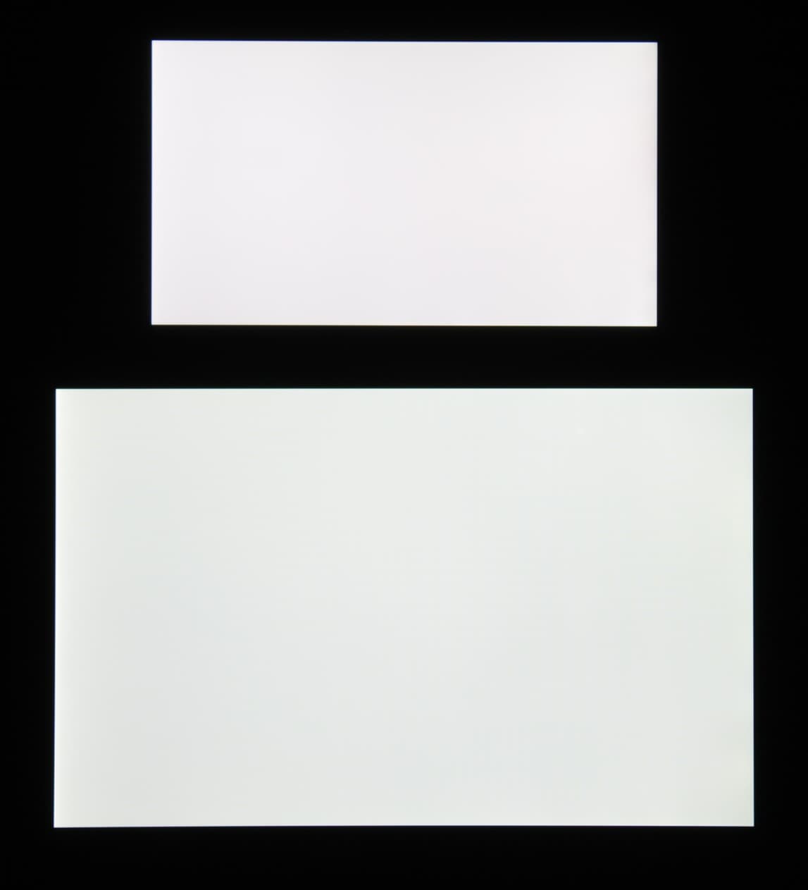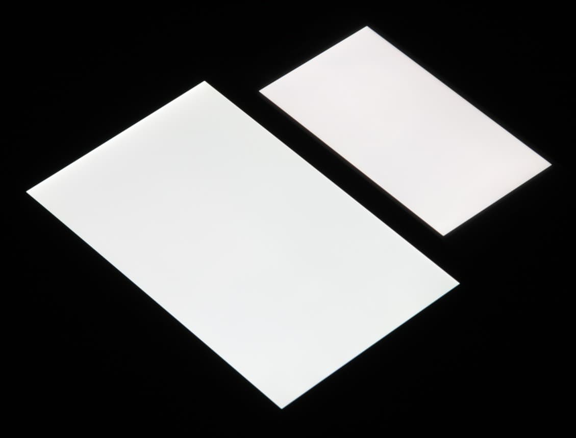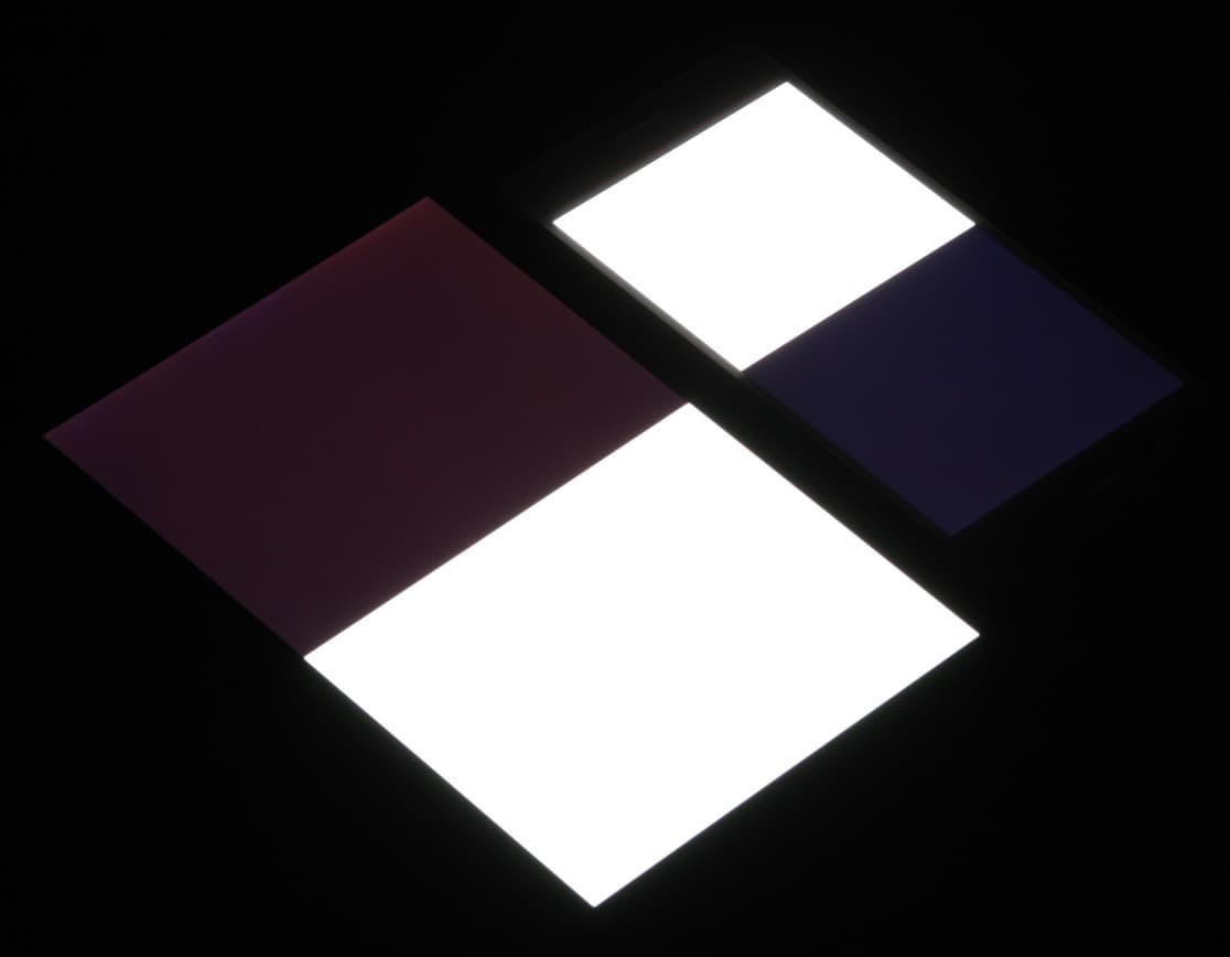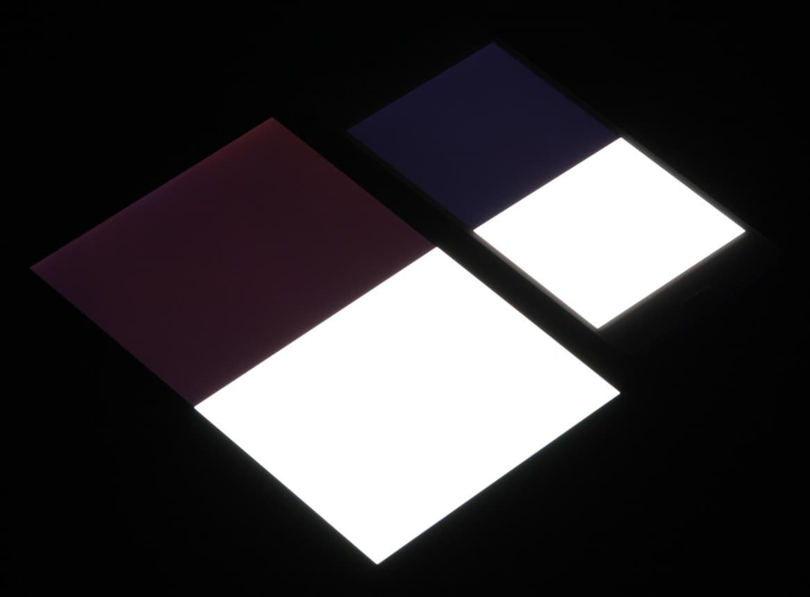Яркость под углом у обоих экранов заметно уменьшилась, но в случае Sony Xperia X Performance падение яркости гораздо меньше. Черное поле при отклонении по диагонали высветляется слабо (как и у Nexus 7) и приобретает фиолетовый оттенок. Фотографии ниже это демонстрируют (яркость белых участков в перпендикулярном плоскости экранов направлении у экранов одинаковая!):