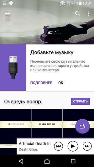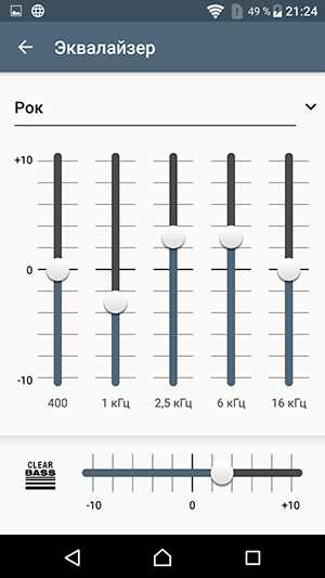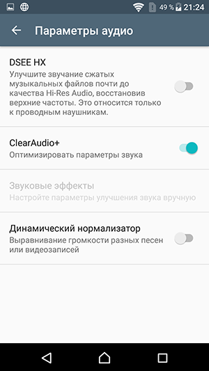 Для проигрывания музыкальных композиций в аппарате используется собственный плеер со знакомым набором настроек: пользователю традиционно предоставляется выбор между ручной регулировкой и автоматической оптимизацией всех параметров звучания с помощью комплексной функции ClearAudio+. В нее входит масса разнообразных технологий, подробнее об этом можно прочитать на отдельной странице сайта Sony, посвященной звуковым технологиям, применяемым во всех современных топовых смартфонах производителя.