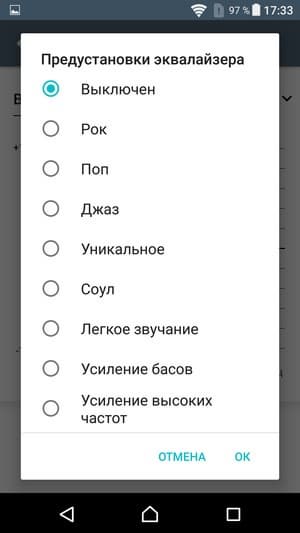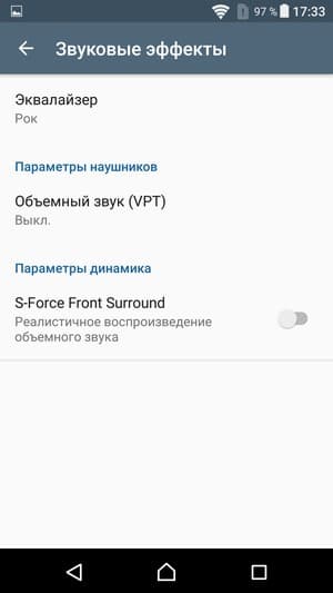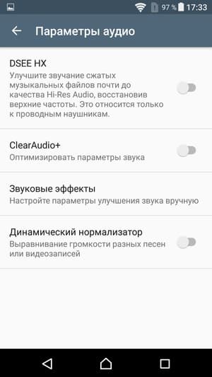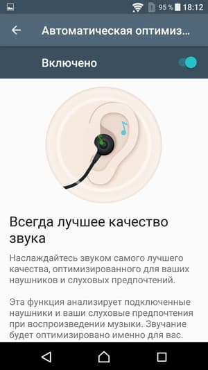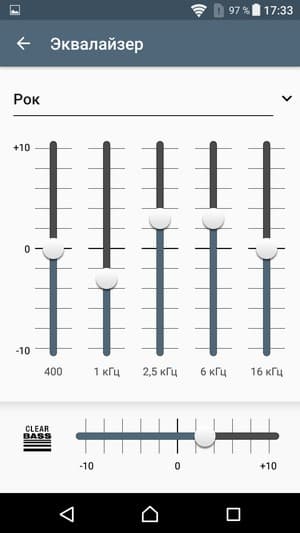Для проигрывания музыкальных композиций в аппарате используется собственный плеер со знакомым набором настроек: пользователю традиционно предоставляется выбор между ручной регулировкой и автоматической оптимизацией всех параметров звучания с помощью комплексной функции ClearAudio+. В нее входит масса разнообразных технологий, подробнее об этом можно прочитать на отдельной странице сайта Sony, посвященной звуковым технологиям, применяемым во всех современных топовых смартфонах производителя.
