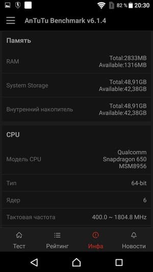 Если судить по данным популярного комплексного теста AnTuTu, платформа Qualcomm Snapdragon 650 находится по современным меркам в среднем сегменте, никак не в верхнем. Там властвуют флагманы с результирующими цифрами от 90K до 130К очков и выше, в то время как герой обзора набирает в AnTuTu 6 только 75К. В графических тестах разрыв тоже есть, но он далеко не так заметен. В сравнении с родственной Snapdragon 652 (на примере LG G5 se) особой разницы мы не обнаружили, однако это можно списать на вдвое более высокое разрешение дисплея у корейского смартфона, что могло отчасти нивелировать превосходство старшей платформы в некоторых тестах.