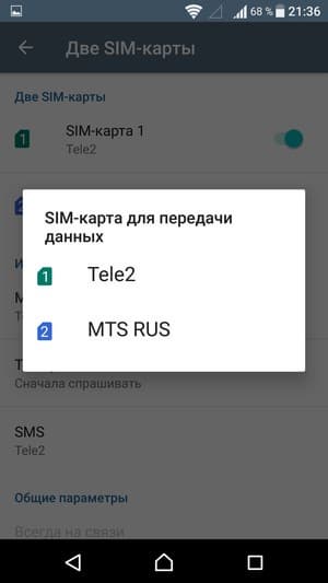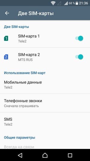 Смартфон обеспечивает работу с двумя SIM-картами по стандарту Dual SIM Dual Standby. Радиомодуль здесь один, поэтому активный разговор может быть только один. С сетями 3G/4G может работать SIM-карта в любом слоте, однако одновременно в этом режиме может работать лишь одна из карт (вторая будет работать только в 2G). Выбор между двумя SIM-картами для осуществления вызова, отправки SMS и пр. можно осуществить заранее или непосредственно перед вызовом.