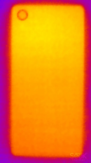 Ниже приведен теплоснимок задней поверхности, полученный после 10 минут работы теста аккумулятора в программе GFXBenchmark (чем светлее, тем выше температура):