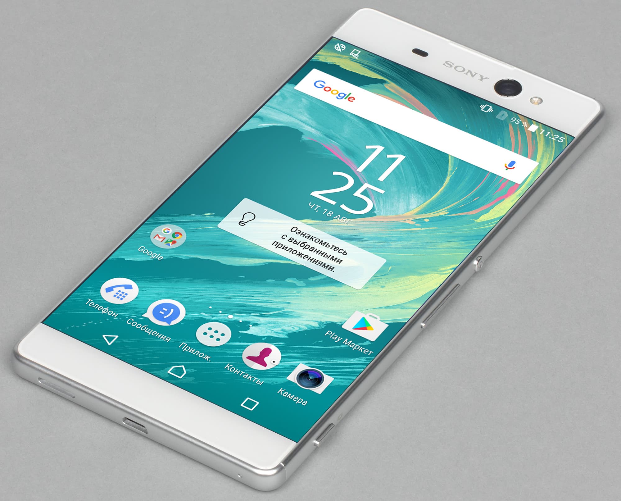 Цвета на экране Sony Xperia XA Ultra немного перенасыщены, телесные оттенки сильно сдвинуты в красную область, а цветовой баланс заметно отличается от стандартного. Конечно, оценивать цветопередачу экрана по фотографии нужно с большой осторожностью, но тенденция передана верно. Теперь под углом примерно 45 градусов к плоскости и к стороне экрана: