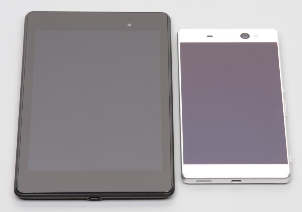 Лицевая поверхность экрана выполнена в виде стеклянной пластины с зеркально-гладкой поверхностью, устойчивой к появлению царапин. Судя по отражению объектов, антибликовые свойства экрана лучше, чем у экрана Google Nexus 7 (2013) (далее просто Nexus 7). Для наглядности приведем фотографию, на которой в выключенных экранах обоих устройств отражается белая поверхность (Sony Xperia XA Ultra, как не трудно определить, — справа, далее их можно различать по размеру):