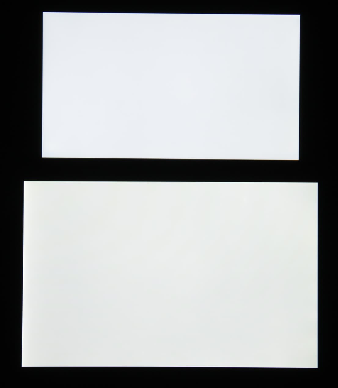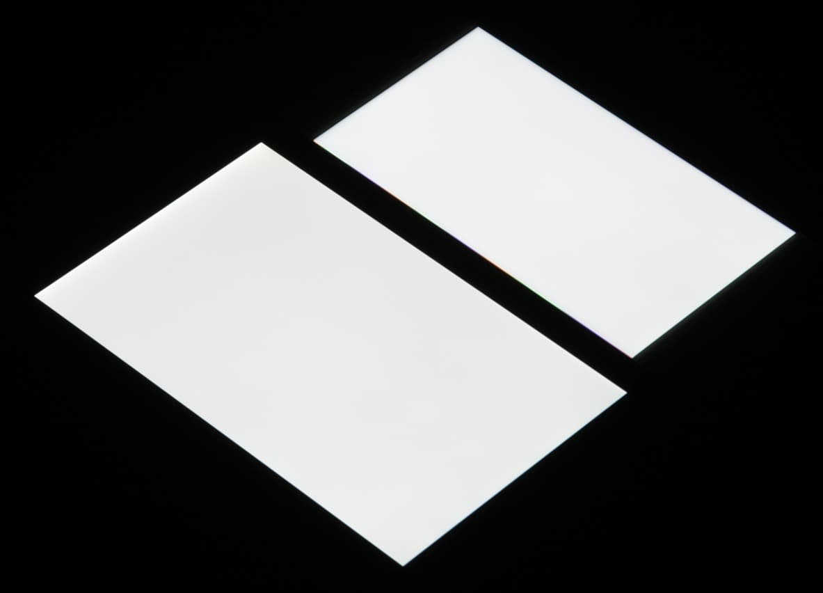 Яркость под углом у обоих экранов заметно уменьшилась, но в случае Sony Xperia XA Ultra падение яркости гораздо меньше. Черное поле при отклонении по диагонали высветляется сильно и приобретает желтоватый оттенок или остается примерно нейтрально-серым. Фотографии ниже это демонстрируют (яркость белых участков в перпендикулярном плоскости экранов направлении у экранов одинаковая!):