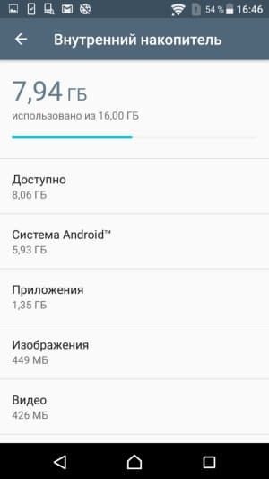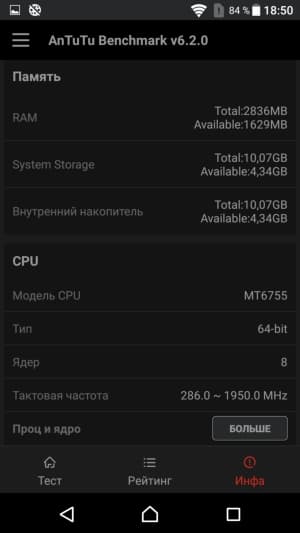 Объем оперативной памяти смартфона составляет 3 ГБ, объем встроенной флэш-памяти — 16 ГБ, из которых не более 10 ГБ изначально доступны пользователю для его нужд. Этот объем можно увеличить за счет карт microSD, и при этом нет необходимости вынимать одну из SIM-карт, так как все три карты устанавливаются в аппарат одновременно, для каждой имеется свой собственный слот. Также есть возможность подключать к порту USB внешние флэш-накопители в режиме OTG. Карты microSD поддерживаются емкостью до 200 ГБ, на практике наша проверочная карта Transcend Premium microSDXC UHS-1 объемом 128 ГБ уверенно распозналась устройством.