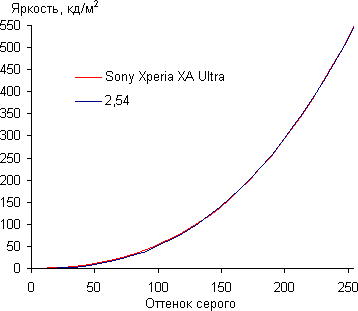 Контрастность (примерно в центре экрана) нормальная — порядка 800:1. Время отклика при переходе черный-белый-черный равно 20 мс (12 мс вкл. + 8 мс выкл.). Переход между полутонами серого 25% и 75% (по численному значению цвета) и обратно в сумме занимает 28 мс. Построенная по 32 точкам с равным интервалом по численному значению оттенка серого гамма-кривая не выявила завала ни в светах, ни в тенях, а показатель аппроксимирующей степенной функции получился 2,54, что больше стандартного значения 2,2. При этом реальная гамма-кривая практически не отклоняется от степенной зависимости: