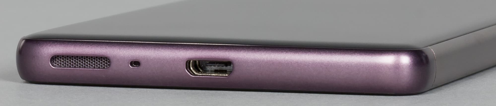 Основной динамик выведен в нижний торец, рядом с разъемом Micro-USB, расположенным по центру и поддерживающим подключение сторонних устройств в режиме USB OTG (USB Host). Между ними можно разглядеть маленькое отверстие разговорного микрофона.