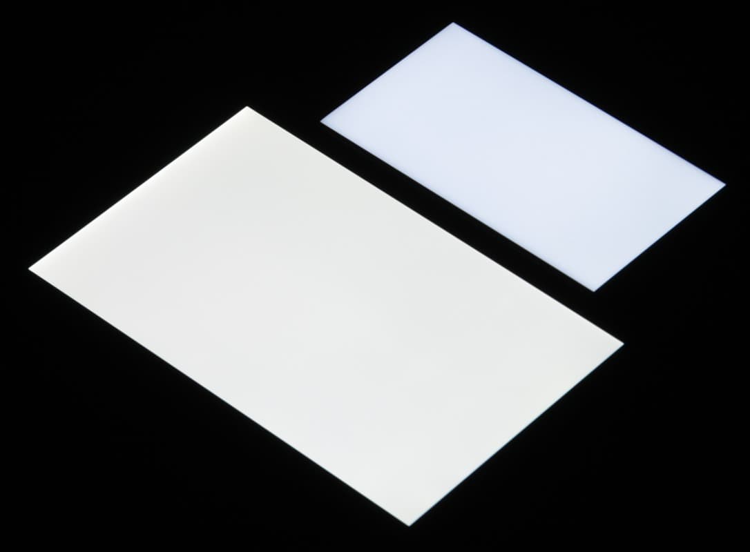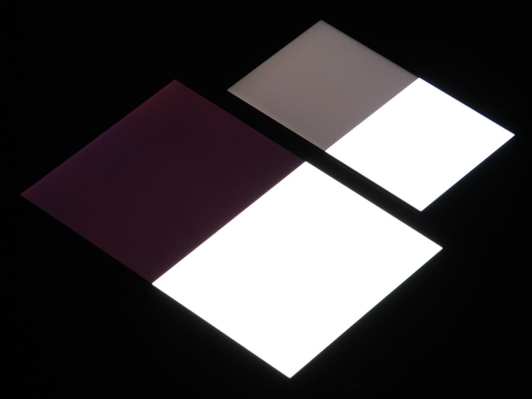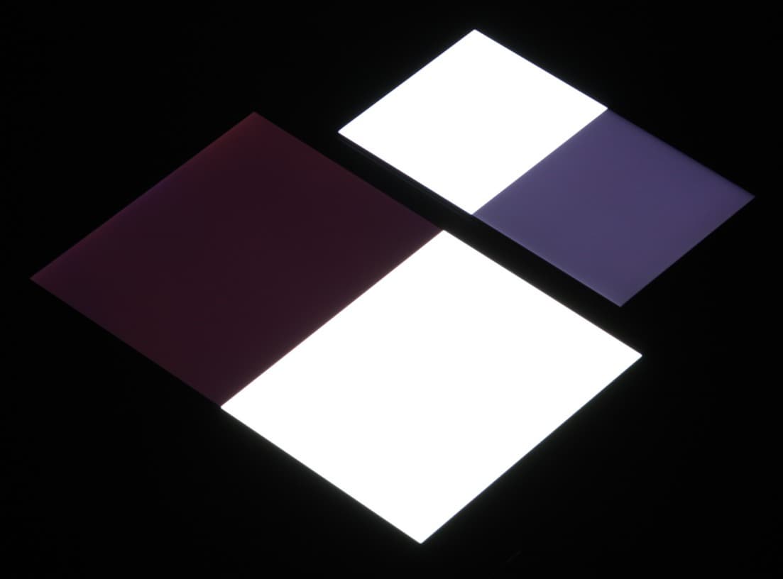 Яркость под углом у обоих экранов заметно уменьшилась, но в случае Sony Xperia XA падение яркости чуть больше. Черное поле при отклонении по диагонали высветляется сильно и приобретает фиолетовый или красноватый оттенок. Фотографии ниже это демонстрируют (яркость белых участков в перпендикулярном плоскости экранов направлении у экранов одинаковая!):