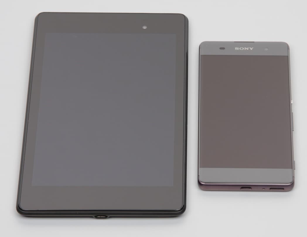 Лицевая поверхность экрана выполнена в виде стеклянной пластины с зеркально-гладкой поверхностью, устойчивой к появлению царапин. Судя по отражению объектов антибликовые свойства экрана лучше, чем у экрана Google Nexus 7 (2013) (далее просто Nexus 7). Для наглядности приведем фотографию, на которой в выключенных экранах обоих устройств отражается белая поверхность (Sony Xperia XA, как не трудно определить, — справа, далее их можно различать по размеру):