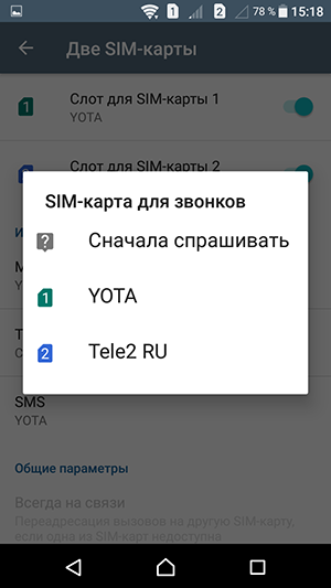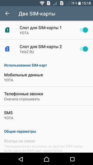 Смартфон обеспечивает работу с двумя SIM-картами по стандарту Dual SIM Dual Standby. Радиомодуль здесь один, поэтому активный разговор может быть только один. С сетями 3G/4G может работать SIM-карта в любом слоте, однако одновременно в этом режиме может работать лишь одна из карт (вторая будет работать только в 2G). Выбор между двумя SIM-картами для осуществления вызова, отправки SMS и пр. можно осуществить заранее или непосредственно перед соединением.