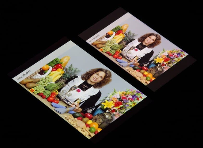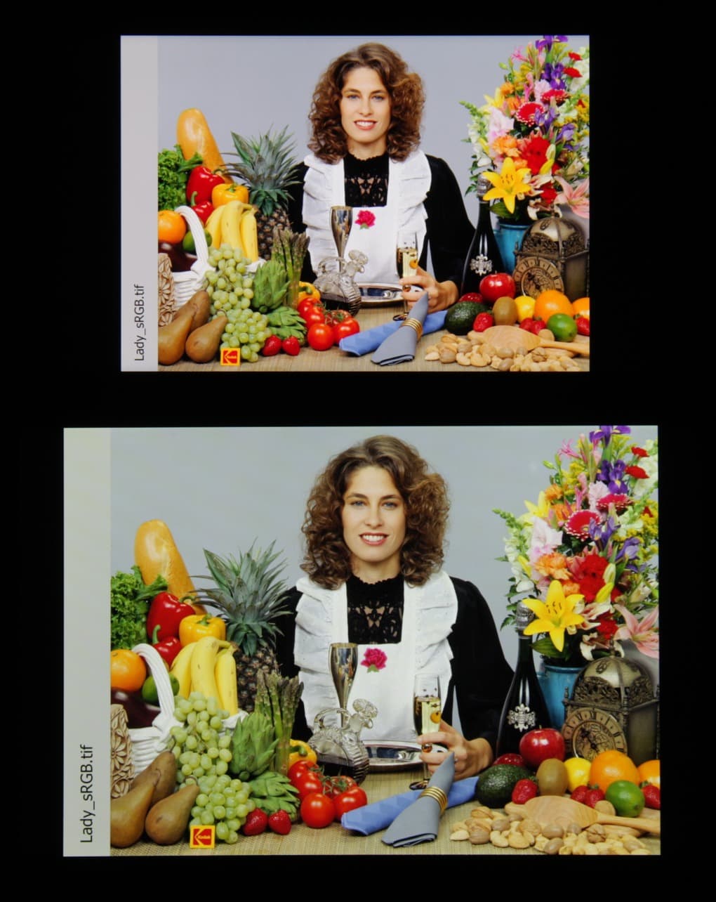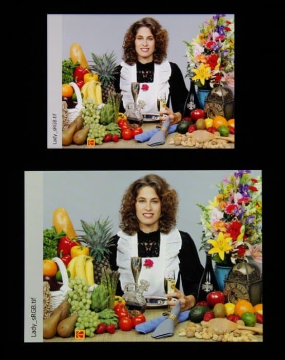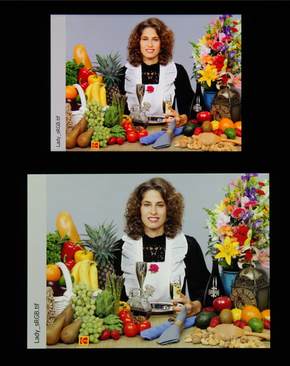 Перегибы на сторонах треугольника показывают, что выполняется какая-то коррекция цветового охвата, но выполняется не совсем корректно, хотя эта задача решается элементарными матричными преобразованиями.