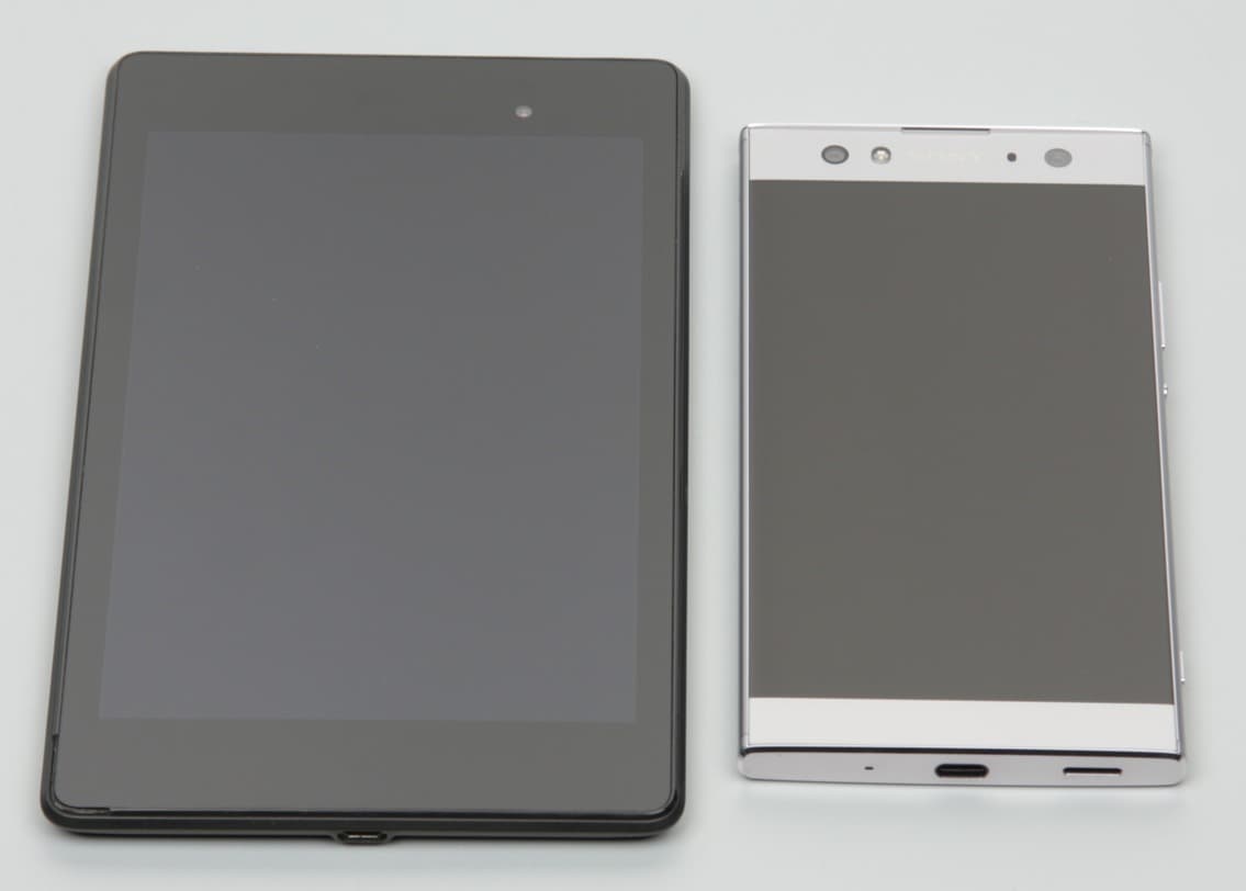 Лицевая поверхность экрана выполнена в виде стеклянной пластины с зеркально-гладкой поверхностью, устойчивой к появлению царапин. Судя по отражению объектов, антибликовые свойства экрана лучше, чем у экрана Google Nexus 7 (2013) (далее просто Nexus 7). Для наглядности приведем фотографию, на которой в выключенных экранах обоих устройств отражается белая поверхность (Sony Xperia XA2 Ultra, как нетрудно определить, справа, далее их можно различать по размеру):