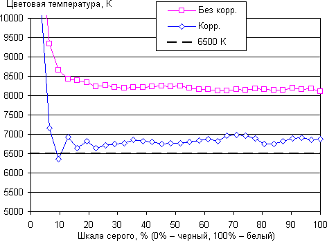 Баланс оттенков на шкале серого компромиссный, так как цветовая температура существенно выше стандартных 6500 К, но отклонение от спектра абсолютно черного тела (ΔE) ниже 10, что для потребительского устройства считается приемлемым показателем. При этом цветовая температура и ΔE мало изменяются от оттенка к оттенку — это положительно сказывается на визуальной оценке цветового баланса. (Самые темные области шкалы серого можно не учитывать, так как там баланс цветов не имеет большого значения, да и погрешность измерений цветовых характеристик на низкой яркости большая.)