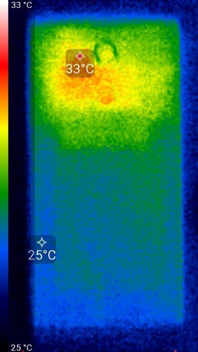 Нагрев выше в верхней части корпуса, где, видимо, находится микросхема SoC. По данным теплокамеры, максимальный нагрев составил всего 33 градуса (при температуре окружающего воздуха в 24 градуса), это совсем мало.