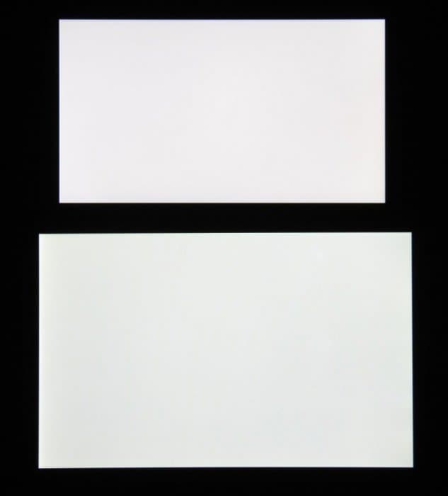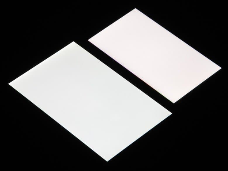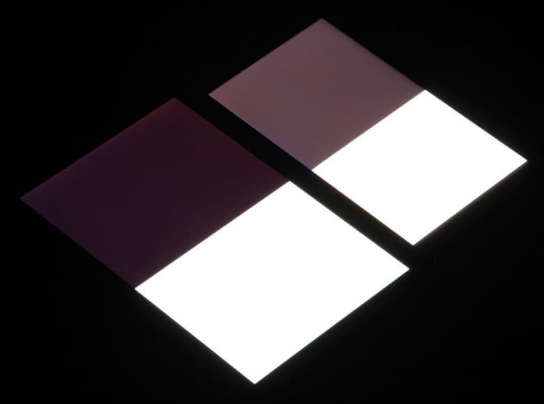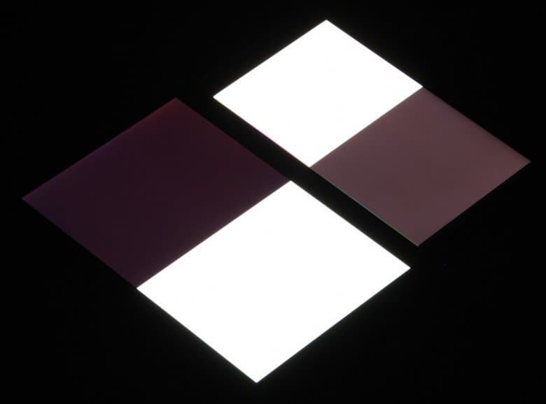 Яркость под углом у обоих экранов заметно уменьшилась, но в случае Sony Xperia XA2 Ultra падение яркости чуть меньше. Отметим, что белое поле у этого смартфона при взгляде под углом приобретает легкий красноватый оттенок. Черное поле при отклонении по диагонали высветляется сильно и также приобретает красноватый оттенок. Фотографии ниже это демонстрируют (яркость белых участков в перпендикулярном плоскости экранов направлении у экранов одинаковая!):